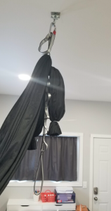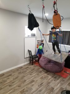 So I put on my thinking cap and searched YouTube. I did find one tutorial that was fairly helpful, but made my own modifications to give it the personal touch that I wanted. This was a really fun project and I LOVE this platform swing and so do the kids I work with, including my own crazy kids that love to put on their helmets and make it swing big arcs. Here are a few pics of the platform swing in action! See my step by step instructions below on how to build your own platform swing for your clinic.