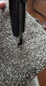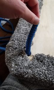 - Next, use the utility knife to press through the carpet in an X to create the hole to put the rope through.