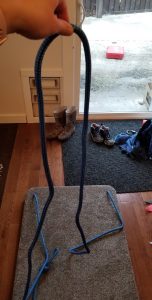- Cut the rope into two equal lengths about 10ft long, (this will very depending on your ceiling height and were you will be hanging the swing from).